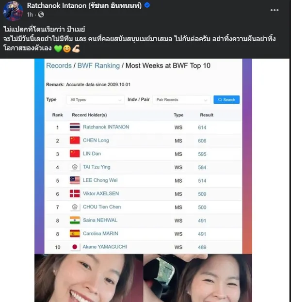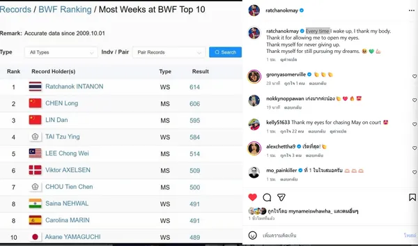เมย์ รัชนก อินทนนท์ นักแบดมินตันหญิงเดี่ยวไทยวัย 31 ปี สร้างสถิติโลกครองอันดับท็อป 10 ของ BWF ยาวนานที่สุด 614 สัปดาห์ แซงหน้า เฉิน หลง และ หลิน ตัน พร้อมเปิดใจขอบคุณร่างกายที่ไม่ยอมแพ้ และยืนยันยังเดินหน้าสู้ตามความฝันต่อไป
