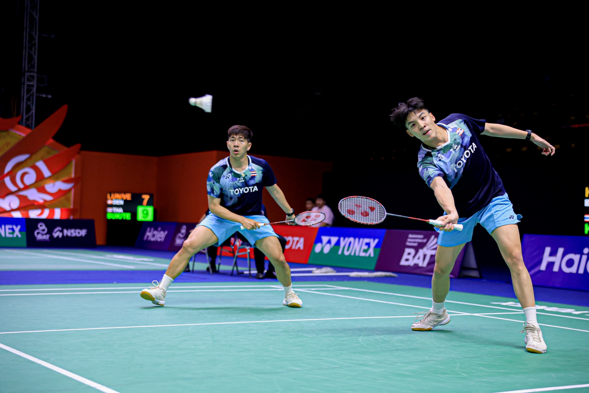 คู่ที่สอง ประเภทชายคู่ มือ 1 "ภีม" ภรัณยู ขาวสำอางค์ กับ “ทีม” วรพล ทองสง่า คู่มืออันดับ 39 ของโลก โชว์ฟอร์มไม่พลาด เอาชนะ โลว เคียงฮาน กับ เจีย เฮา โฮวิน หว่อง ไปได้ 2 เกมรวด 21-11 , 22-20 ไทย ตามตีเสมอ 1-1 คู่