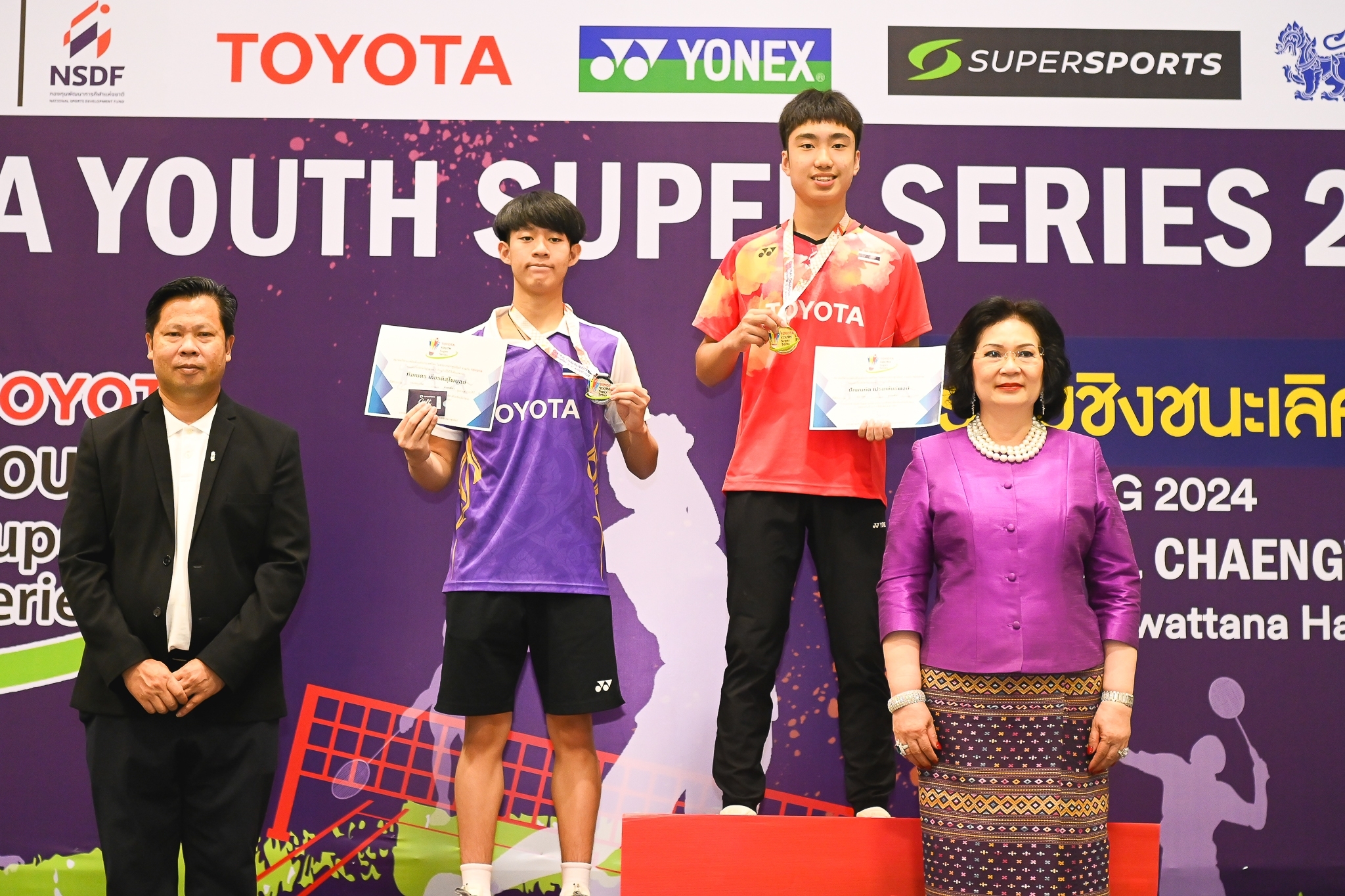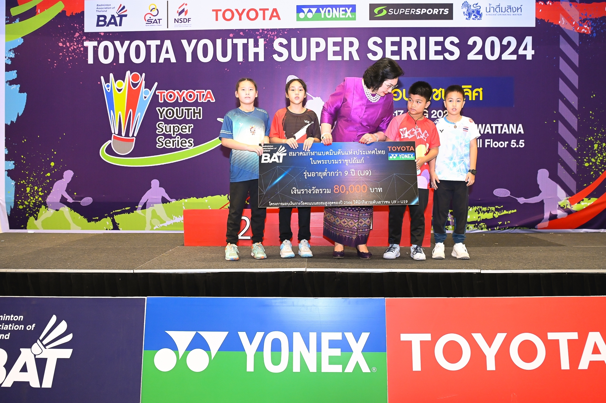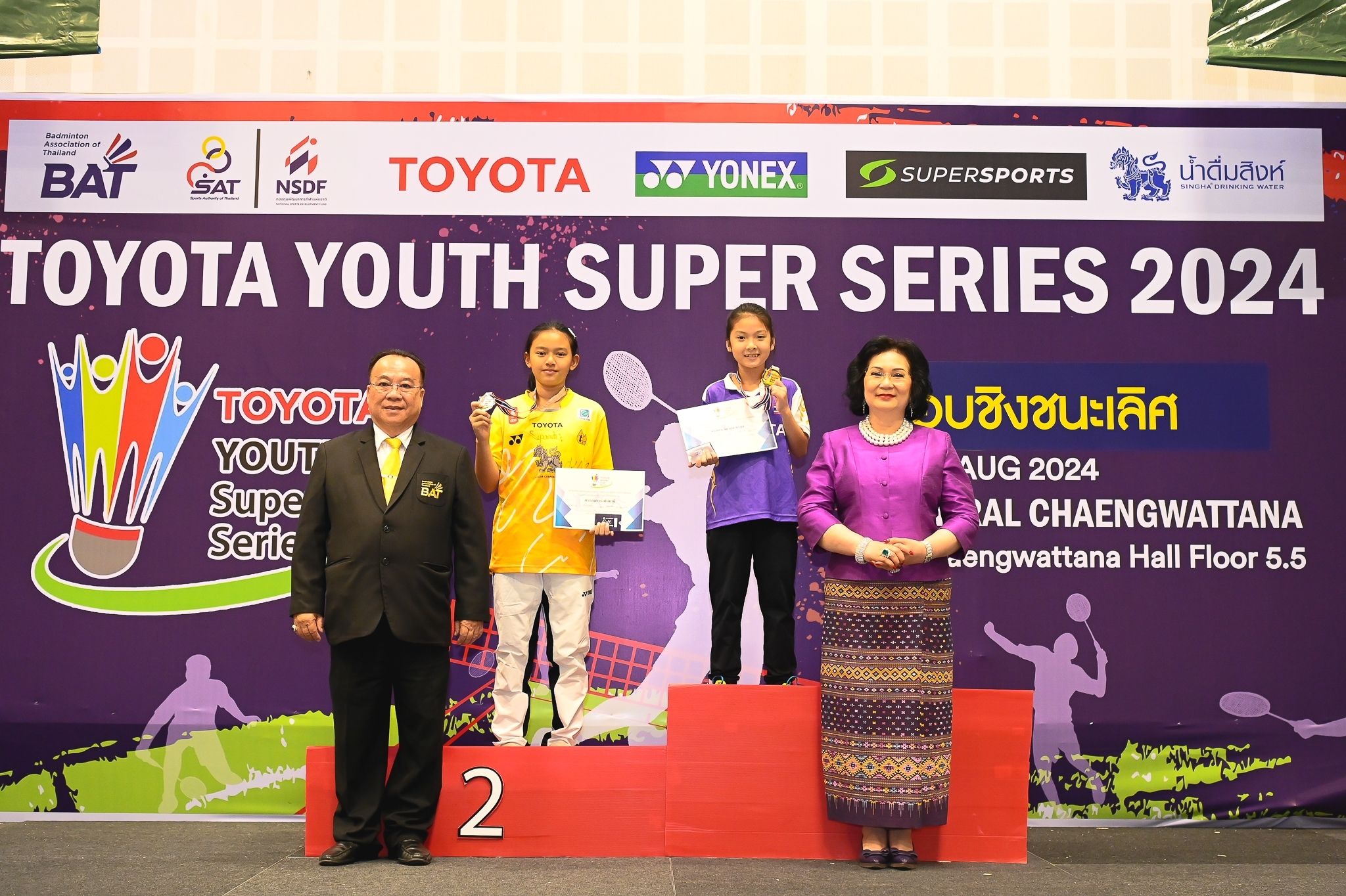โดยได้รับเกียรติจากคุณหญิงปัทมา ลีสวัสดิ์ตระกูล กรรมการคณะกรรมการโอลิมปิกสากล , รองประธานสหพันธ์แบดมินตันโลก และ นายกสมาคมกีฬาแบดมินตันแห่งประเทศไทย ในพระบรมราชูปถัมภ์ , คุณทัศนะ พฤกษาไพศาลศิลป์ อุปนายกสมาคม และนายทะเบียนสมาคมกีฬาแบดมินตันแห่งประเทศไทย ในพระบรมราชูปถัมภ์ , คุณสุรเดช สนธิอรุณทัต ผู้จัดการฝ่ายการตลาดบริษัท ฟาร์อีสท์สเปเชียลลิตี้ จำกัด (โยเน็กซ์ ประเทศไทย) และ คุณไพรัช ธัญญเจริญ ผู้ช่วยผู้จัดการ บริษัท โตโยต้า มอเตอร์ ประเทศไทย จำกัด ร่วมกันมอบรางวัลและ Gift Vocher ให้กับนักกีฬา