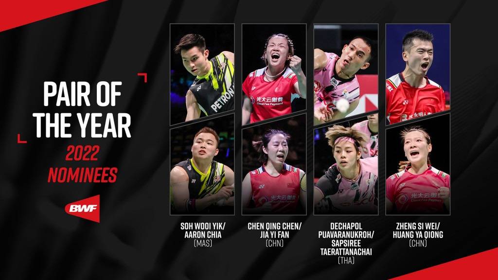 3. BWF Pair of the Year (รางวัลนักแบดมินตันคู่ยอดเยี่ยมแห่งปี) ประกอบไปด้วย "บาส" เดชาพล พัววรานุเคราะห์ กับ "ปอป้อ" ทรัพย์สิรี แต้รัตนชัย (ไทย) , อารอน เชี๊ยะ กับ โซว วุยอิค (มาเลเซีย) , เฉิน ยิงเฉิน กับ เจีย ยี่ฟาน (จีน) และ เจิ้ง ซีเว่ย กับ หวง ย่าเฉียง (จีน)