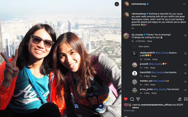 ด้าน ไถ้ ซื่อหยิง ก็ได้เข้ามาตอบคอมเมนต์ของ รัชนก อย่างอบอุ่นว่า "ขอบใจนะ เธอเองก็ยอดเยี่ยมไม่แพ้กัน ฉันจะคอยให้กำลังใจเธอในทัวร์ต่อไปนะ" ขณะที่ เกรกลอเรีย มาริสก้า ตุนจุง หญิงเดี่ยวของ อินโดนีเซีย ก็ร่วมแสดงความคิดเห็นว่าทั้งสองคนคือ "ไอดอล" ของเธอ