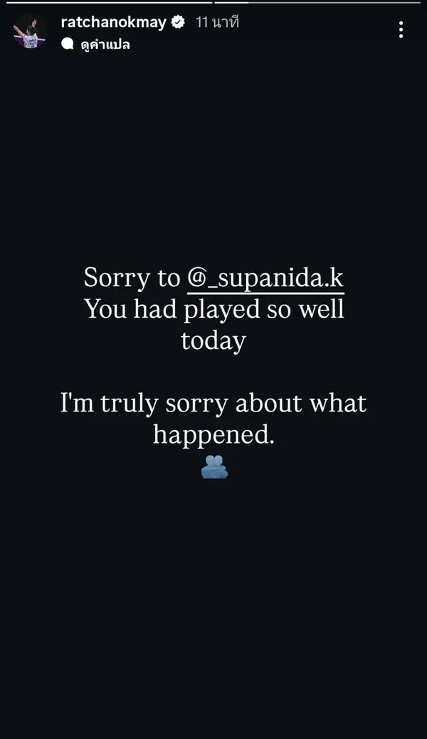 ล่าสุดหลังจบการแข่งขันเมย์ รัชนก อินทนนท์ ได้โพสต์ไอจีสตอรี่ส่วนตัว ratchanokmayแสดงความเสียใจต่อเหตุการณ์ที่เกิดขึ้น โดยมีใจความว่า Sorry to @_supanida.k You had played so well today I'm truly sorry about what happened. ซึ่งแปลว่า ฉันขอโทษ เม ศุภนิดา ที่วันนี้เล่นได้อย่างยอดเยี่ยมมาก และเสียใจอย่างสุดซึ้งกับอุบัติเหตุที่เกิดขึ้นในสนาม