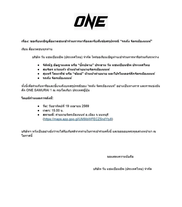 ONE Championship ร่อนหนังสือเชิญสื่อมวลชนร่วมทำข่าวการแถลงข่าวครั้งสำคัญ เพื่อหาข้อสรุปและแนวทางปฏิบัติร่วมกันระหว่างทุกฝ่ายที่เกี่ยวข้องกับ รถถัง จิตรเมืองนนท์ ยอดมวยซูเปอร์สตาร์ระดับโลก โดยมีกำหนดการจัดขึ้นในวันอาทิตย์ที่ 19 เมษายน 2569 เวลา 15.00 น. ณ ค่ายมวยจิตรเมืองนนท์ จังหวัดนนทบุรี