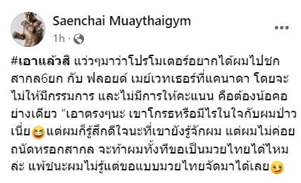"เอาแล้วสิ แว่วๆมาว่าโปรโมเตอร์อยากได้ผมไปชกสากล6ยก กับ ฟลอยด์ เมย์เวทเธอร์ที่แคนาดา โดยจะไม่ให้มีกรรมการ และไม่มีการให้คะแนน คือต้องน้อคอย่างเดียว “เอาตรงๆนะ เขาโกรธหรือมีไรในใจกับผมป่าวเนี่ย แต่ผมก็รู้สึกดีใจนะที่เขายังรู้จักผม แต่ผมไม่ค่อยถนัดหรอกสากล จะท้าผมทั้งทีขอเป็นมวยไทยได้ไหมล่ะ แพ้ชนะผมไม่รู้แต่ขอแบบมวยไทยจัดมาได้เลย"