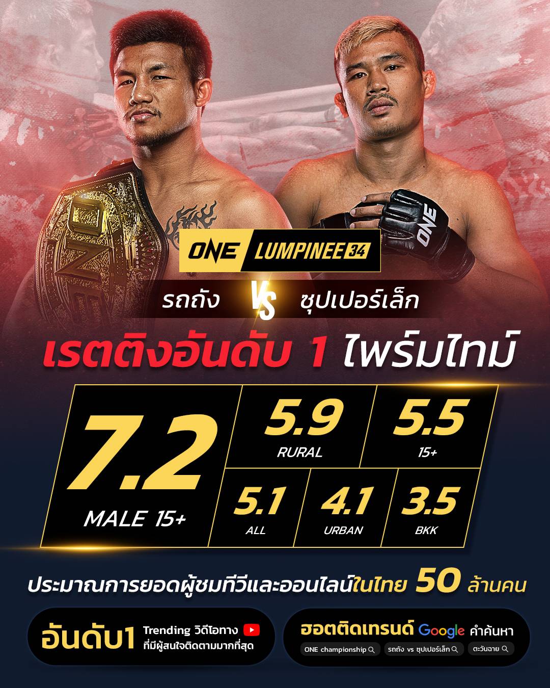 ศึก ONE ลุมพินี 34 คู่เอก "รถถัง vs ซุปเปอร์เล็ก" ทุบสถิติยอดรับชมสูงสุดในประวัติศาสตร์มวยไทย ครองอันดับ 1 ช่วงเวลาไพรม์ไทม์ (เวลาที่มีผู้ชมมากที่สุด) ด้วยเรตติ้ง 7.2 สำหรับกลุ่มผู้ชายอายุ 15 ปีขึ้นไป และ 5.1 สำหรับกลุ่มผู้ชมทั่วประเทศ ทุกเพศ ทุกช่วงอายุ
