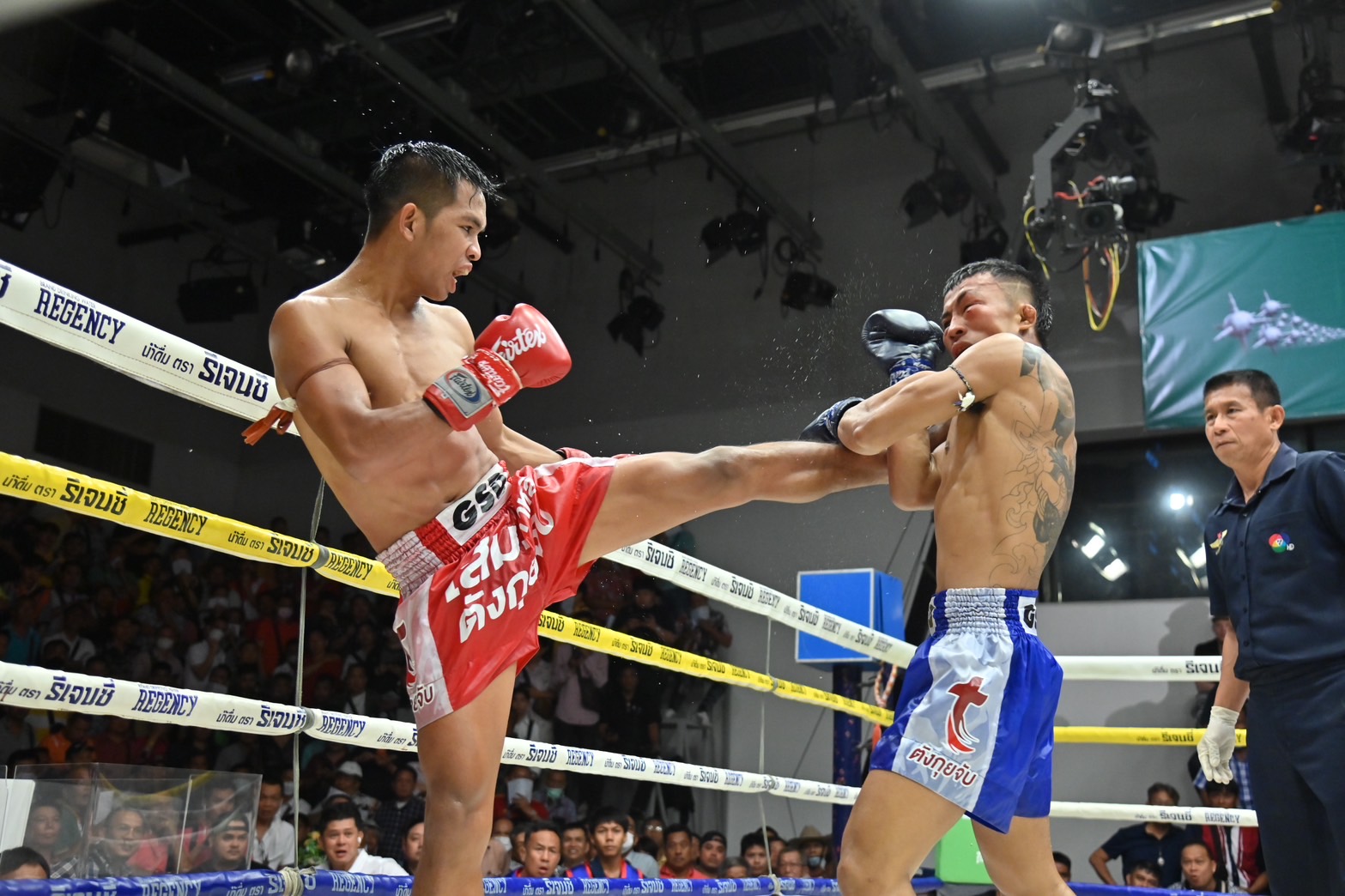 ราชเดช ทีเอ็นมวยไทย ระเบิดฟอร์มที่สุดยอด เมื่อดักเตะซ้ายฟันศอกใส่จน พยัคฆ์อุดร ศิษย์เจ๊กานต์ แตกเปลือกตาบวมปูด ก่อนคุมเกมไว้อย่างสบายครบยก ราชเดชต้อนแต้มชนะไปแบบขาดลอยม้วนเดียวจบ