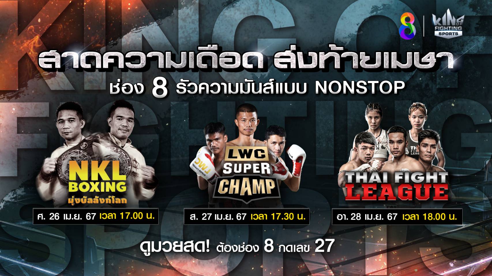 ช่อง 8 ปล่อยหมัดเด็ดยิงสด 3 รายการมวยดังสุดสัปดาห์ ปิดท้ายเดือนเมษายน ในรายการ NKL Boxing มุ่งบัลลังก์โลก ถ่ายทอดสดในวันศุกร์ที่ 26 เมษายน เวลา 17.00 น. ต่อด้วยรายการ LWC SUPER CHAMP ถ่ายทอดสดในวันเสาร์ที่ 27 เมษายน เวลา 17.30 น. และปิดท้ายรายการ THAI FIGHT LEAGUE ถ่ายทอดสดในวันอาทิตย์ที่ 28 เมษายน เวลา 18.00 น. แฟนมวยดูเต็มอิ่ม