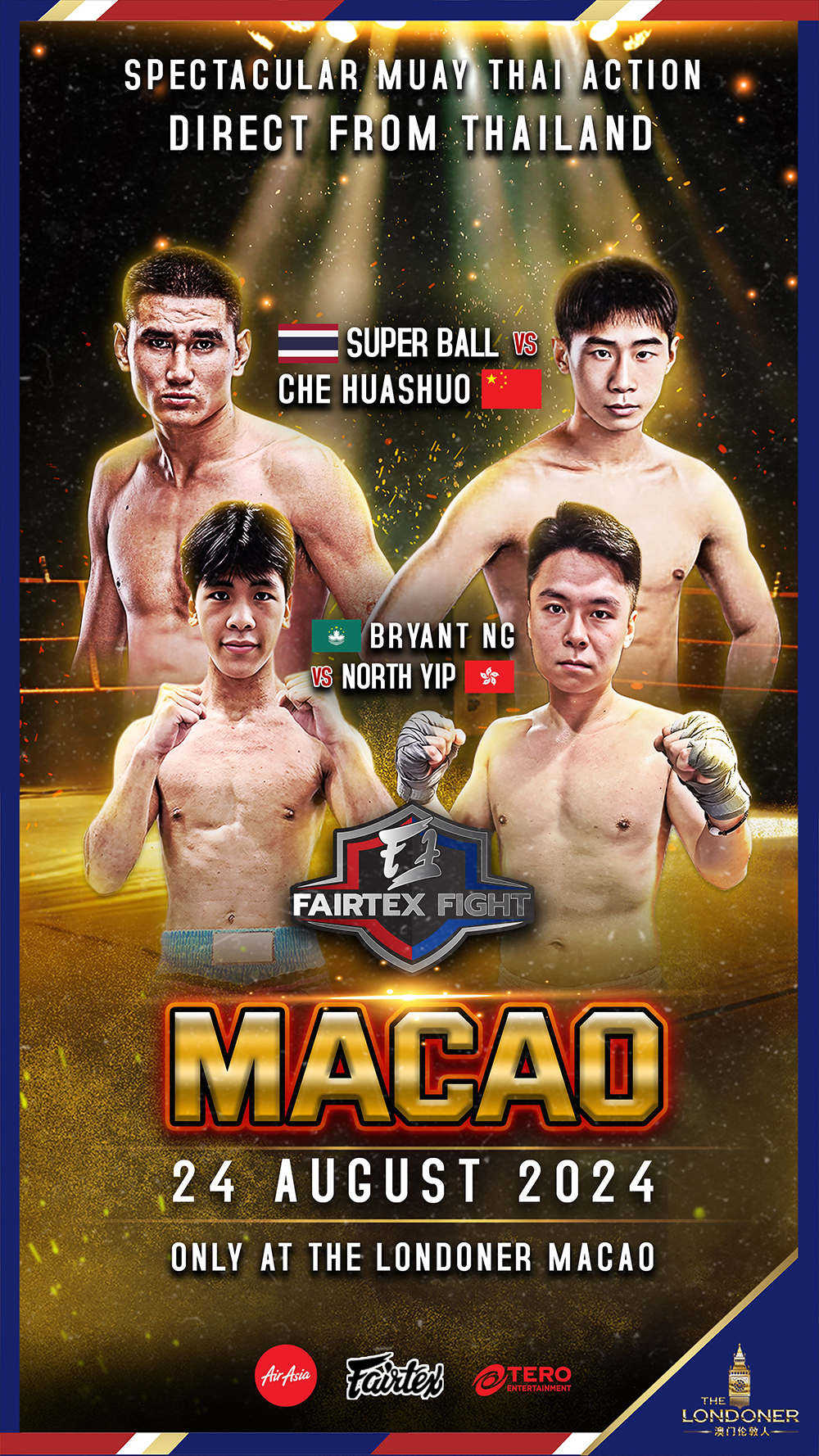 ครั้งแรก! กับการจับมือกันอย่างยิ่งใหญ่ระดับโลก ระหว่าง The Londoner Macao แบรนด์โรงแรม สุดหรูที่มีวิสัยทัศน์ในการนำเสนออีเว้นท์ระดับโลกอย่างต่อเนื่อง ร่วมกับ Fairtex Fight ผู้นำแห่งวงการมวยไทยและยังเป็นผู้จัดจำหน่ายอุปกรณ์กีฬาต่อสู้และอุปกรณ์คุณภาพสูงของแฟร์เท็กซ์ที่วางจำหน่ายในหลายประเทศ และ TERO Entertainment ผู้ผลิตสื่อและผู้นำด้านการจัดอีเว้นท์ระดับโลก ผุดการแข่งขันมวยไทยแมตช์พิเศษ "Fairtex Fight Muay Thai Boxing Event" ขึ้นเป็นครั้งแรก นำทีมโดยนักชกดังจากฝั่งไทยปะทะกับนักมวยดังระดับนานาชาติกับโปรดักชั่นสุดยิ่งใหญ่ อลังการ โดยมีเป้าหมายหลักคือการส่งเสริมการท่องเที่ยวและกีฬาและกระตุ้นเศรษฐกิจ เสริมสร้างภาพลักษณ์ของประเทศไทยและมาเก๊า รวมถึงการต่อยอดมวยไทยให้เป็นกีฬาที่นิยมในระดับโลก