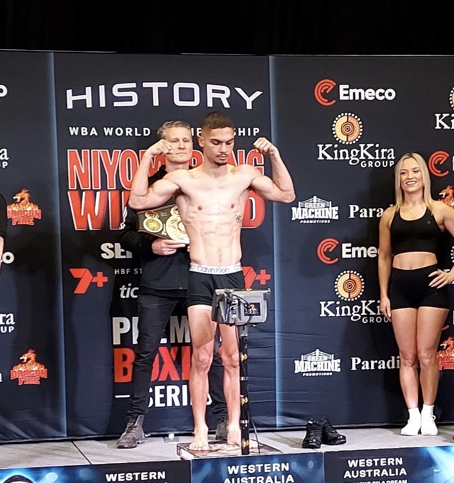 ล่าสุดเมื่อเวลา 16.00 น. ตามเวลาท้องถิ่นประเทศออสเตรเลียได้มีการชั่งน้ำหนักอย่างเป็นทางการของทั้งคู่ น็อคเอาท์ ขึ้นชั่งคนแรกปรากฎว่าได้ 104.5 ปอนด์ จากนั้น วินวู้ด ขึ้นชั่งบ้างได้ 104.5 ปอนด์เท่ากัน ต่ำกว่าพิกัดทั้งคู่ พร้อมที่จะตะบันหน้ากันอย่างแน่นอนโดยมีเข็มขัดแชมป์โลกรุ่น 105 ปอนด์ของ น็อคเอาท์ เป็นเดิมพัน