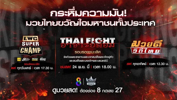 ห้ามพลาดชม 3 รายการมวยไทยสุดสัปดาห์ การันตีความมันที่สุดของประเทศใน รายการ LWC SUPER CHAMP (ลุมพินีเวิลด์ แชมเปี้ยนชิพ ซุปเปอร์แชมป์) ในวันเสาร์ที่ 23 พฤศจิกายน เวลา 17.30 น. พร้อมปิดท้ายในวันอาทิตย์ที่ 24 พฤศจิกายน กับรายการ มวยดีวิถีไทย เวลา 12.30 น. และ รายการ THAI FIGHT อาจารย์ต้อม เวลา 18.00 น. ทางช่อง 8