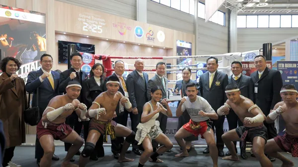 แฟนๆกีฬาและนักธุรกิจทั่วโลก ทึ่งฝีมือ พระจันทร์ฉาย พี.เค.แสนชัยมวยไทยยิม และ ดวงดาวน้อย ลูกทรายกองดิน 2 นักชกแชมป์โลกชื่อดัง ที่มาร่วมโชว์ศิลปะแม่ไม้มวยไทย ในงานไอทีบี เบอร์ลิน 2025 ที่เยอรมนี ขณะที่ สรวงศ์ เทียนทอง รัฐมนตรีกีฬา ย้ำมวยไทยเป็นหนึ่งในกลไก ที่ช่วยประชาสัมพันธ์ประเทศ และส่งเสริมสปอร์ตทัวริซึมของไทยได้เป็นอย่างดี
