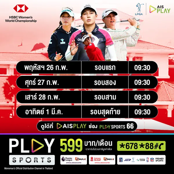 สำหรับลูกค้า AIS สามารถรับชมการแข่งขัน LPGA ตลอดฤดูกาล 2026 รวมถึงคอนเทนต์กีฬาระดับโลก อาทิ PGA Tour, ฟุตบอลพรีเมียร์ลีก อังกฤษ, NFL และ NBA เพียงสมัครแพ็กเกจ PLAY SPORTS ราคา 599 บาท/เดือน (ไม่รวม VAT) พิเศษรวมความบันเทิงจาก Prime Video และ Monomax สมัครกด *678*88# โทรออก หรือผ่านเว็บไซต์ https://www.ais.th/consumers/entertainment/ais-play/play-sports