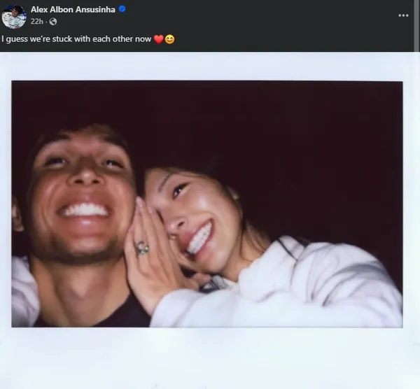โดย อเล็กซานเดอร์ อัลบอน อังศุสิงห์ ได้แจ้งข่าวผ่านทางเฟสบุ๊กส่วนตัว Alex Albon Ansusinha พร้อมลงภาพสุดหวานและระบุข้อความสั้นๆ ที่เปี่ยมด้วยความหมายว่า "I guess we’re stuck with each other now" (สงสัยเราคงต้องติดแหง็กอยู่ด้วยกันตลอดไปแล้วล่ะ) ซึ่งเป็นการยืนยันถึงการตัดสินใจเริ่มต้นชีวิตคู่ร่วมกันหลังจากคบหาดูใจกันมาอย่างยาวนาน