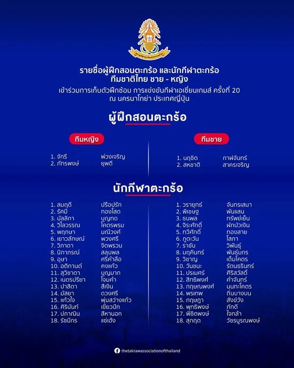 สมาคมกีฬาตะกร้อฯ ประกาศรายชื่อนักกีฬาชุดสู้ศึกเอเชียนเกมส์ ครั้งที่ 20 ตั้งเป้ากู้ศักดิ์ศรีทวงคืนเหรียญทอง ณ นครนาโกย่า
