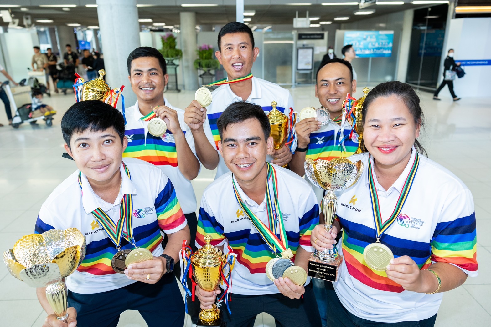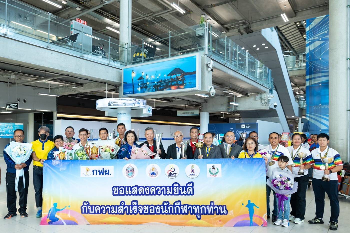 คณะทัพนักเปตองทีมชาติไทย ชุดสร้างประวัติศาสตร์ คว้า 3 เหรียญทอง 1 เหรียญเงิน 1 เหรียญทองแดง ในการแข่งขันศึกเปตองชิงแชมป์โลก 2023 ที่เมืองโกโตนู ประเทศเบนิน เดินทางกลับมาถึงไทยแล้ว ที่สนามบินสุวรรณภูมิ เป็นที่เรียบร้อยแล้ว เมื่อช่วงเช้าวันที่ 21 ก.ย.66 โดยมี นายชุริน ภัทรดิลก อุปนายกสมาคมกีฬาเปตองแห่งประเทศไทย และนายสุนชัย คำนูณเศรษฐ์ อุปนายกสมาคมกีฬาเปตองฯ พร้อมด้วย นายชัยวุฒิ หลักเมือง ผู้ช่วยผู้ว่าการบริหารจัดการความยั่งยืน และ นายสมศักย์ ปรางทอง ผู้อำนวยการฝ่ายบริหารด้านการใช้ไฟฟ้า และกิจการเพื่อสังคมกฟผ.ไปให้การต้อนรับคณะนักเปตองแชมป์โลก ท่ามกลางญาติพี่น้องและเพื่อนๆอย่างคับคั่ง