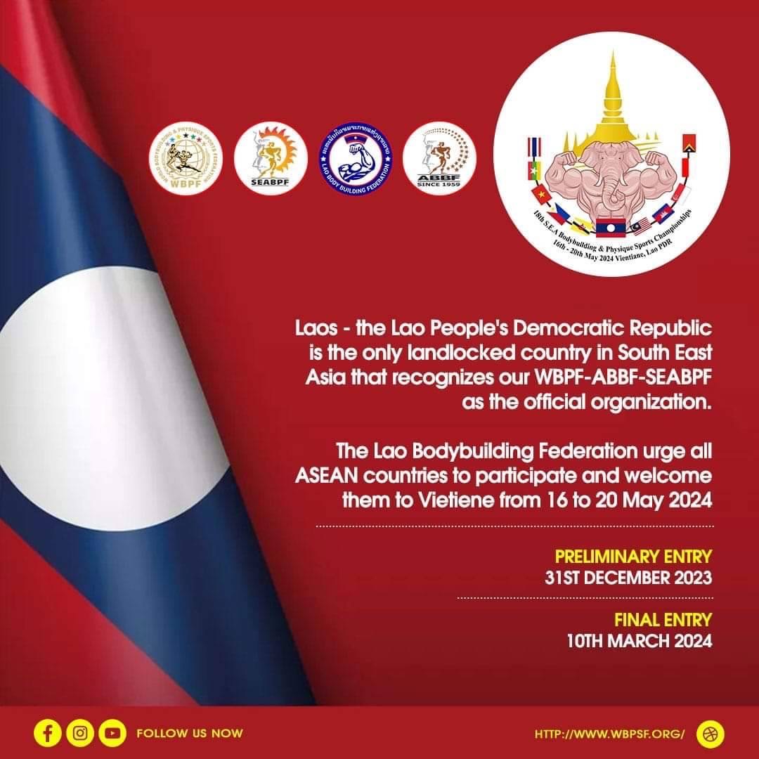 นายศุกรีย์ สุภาวรีกุล นายกสมาคมกีฬาเพาะกายและฟิตเนสแห่งประเทศไทย ในฐานะเลขาธิการสหพันธ์กีฬาเพาะกายและฟิตเนสแห่งเอเชีย (ABBF) และเลขาธิการร่วมสหพันธ์กีฬาเพาะกายและฟิตเนสโลก (WBPF ) เปิดเผยว่าทางสหพันธ์กีฬาเพาะกายและฟิตเนสของสปป.ลาว ได้เสนอตัวขอเป็นเจ้าภาพจัดการแข่งขันกีฬาเพาะกายและฟิตเนสชิงแชมป์เอเชียตะวันออกเฉียงใต้ ครั้งที่ 18 ในคราวการประชุมใหญ่ของสหพันธ์กีฬาเพาะกายและฟิตเนสแห่งเอเชีย ที่เมืองกาฐมาณฑุ เมื่อช่วงเดือนกันยายนปีที่ผ่านมา