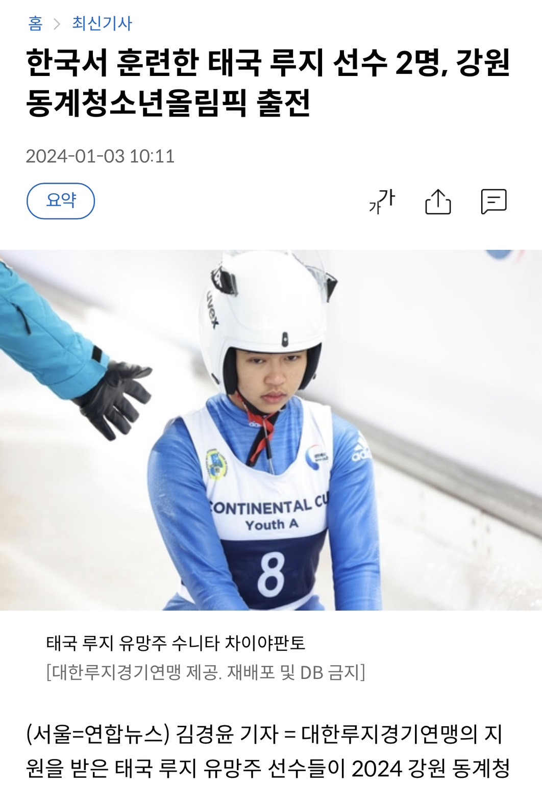 ทัพนักกีฬาเยาวชนฤดูหนาวไทยกลายเป็นที่จับตาของสื่อเกาหลีใต้ เจ้าภาพกีฬาโอลิมปิกเยาวชนฤดูหนาว 2024 หลังสำนักข่าวยอนฮับ ที่เกาะติดตามทีมลูจไทยเนื่องจากนักกีฬาไทยได้รับการสนับสนุนจากสหพันธ์ลูจ สภากีฬาเกาหลีใต้ และมูลนิธิ Pyeongchang Memorial Foundation เมื่อปี 2018 สามารถพัฒนาตัวเองจนผ่านคลอลิฟายยูธโอลิมปิกฤดูหนาว 2024 ได้ โดยนักกีฬาไทยทั้ง 19 คนตอนนี้ที่ผ่านควอลิฟาย อยู่ระหว่างการฟิตซ้อมที่เกาหลีใต้อย่างเต็มที่ ปรับร่างกายกับอุณหภูมิเฉลี่ย 5 องศา