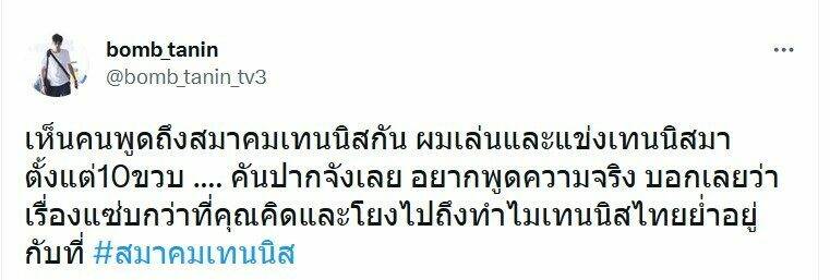 โดยข้อความของนักแสดงหนุ่ม โพสต์ระบุว่า "เห็นคนพูดถึงสมาคมเทนนิสกัน ผมเล่นและแข่งเทนนิสมาตั้งแต่ 10 ขวบ คันปากจังเลย อยากพูดความจริง บอกเลยว่าเรื่องแซ่บกว่าที่คุณคิดและโยงไปถึงทำไมเทนนิสไทยย่ำอยู่กับที่ #สมาคมเทนนิส" ทำให้มีหลายคนต่างเข้ามารอติดตามต่อว่า บอม จะแฉเรื่องอะไร