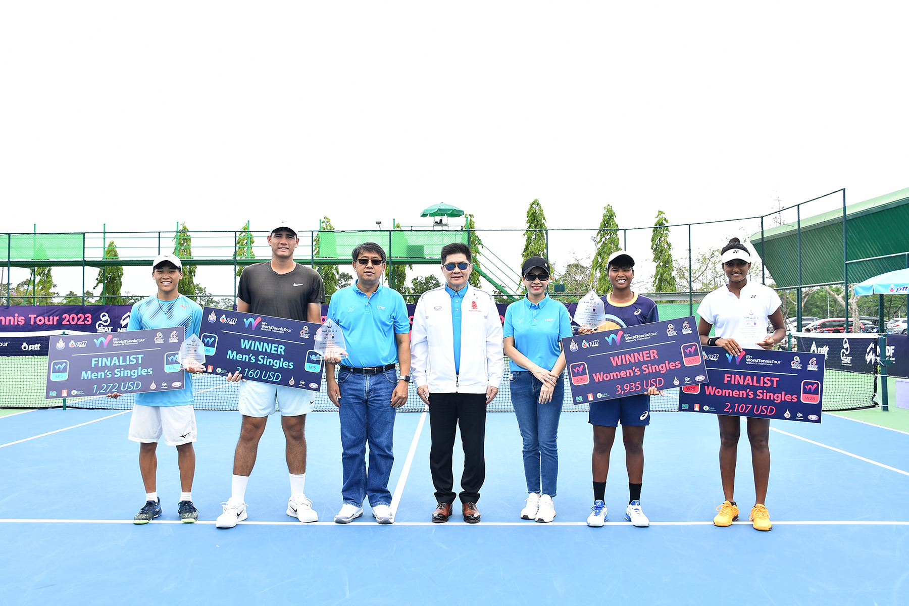 "ไหม" มนัญชญา สว่างแก้ว นักเทนนิสไทย มือวางอันดับ 6 ของรายการ เอาชนะ สาฮาชา ยามาลาปัลลี นักหวดอินเดีย 2 เซตรวด คว้าแชมป์หญิงเดียว "ไอทีเอฟ โปร เซอร์กิต พรีเซนเต็ด บาย เอสเอที" สนาม 5 ส่วน "แม็กซิ" แม็กซิมัส ภราพล โจนส์ นักหวดหนุ่มลูกครึ่งไทย-ออสเตรเลีย ที่ได้สิทธิ์ไวลด์การ์ดลงแข่งขัน โชว์ฟอร์มเยี่ยมสยบ ริวกิ มัตสึดะ นักหวดหนุ่มญี่ปุ่น มือ 5 ได้สำเร็จ 2-0 เซต ครองแชมป์ชายเดี่ยว"ไอทีเอฟ เมนส์ เซอร์กิต ทัวร์ 2023 (2)" ที่สนามเทนนิส ภายในสนามกีฬากลางตุมปัง มหาวิทยาลัยวลัยลักษณ์ จังหวัดนครศรีธรรมราช เมื่อวันที่ 9 ก.ค. 2566 ที่ผ่านมา