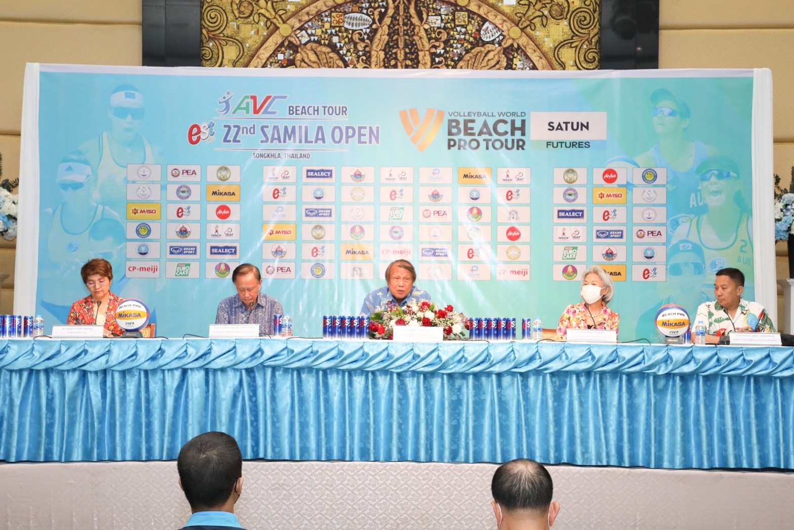 นายสมพร ใช้บางยาง นายกสมาคมกีฬาวอลเลย์บอลแห่งประเทศไทย พร้อมด้วย เรืออากาศโทชาญฤทธิ์ วงษ์ประเสริฐ รองประธานกิตติมศักดิ์ตลอดชีพ สหพันธ์วอลเลย์บอลแห่งเอเชีย, คุณธารทิพย์ ศิรินุพงศ์ ผู้อำนวยการโครงการพัฒนาชุมชน บริษัท ไทยเบฟเวอเรจ จำกัด (มหาชน) ผู้แทน บริษัท ไทยดริ้งค์ จำกัด ผู้ผลิตเครื่องดื่ม "เอสโคล่า", นายกองเอก พุทธ กฤชคงพันธุ์ รองผู้ว่าราชการจังหวัด ปฏิบัติราชการแทน ผู้ว่าราชการจังหวัดสงขลา และ นางปุณณานันท์ ทองหยู ท่องเที่ยวและกีฬาจังหวัดสตูล ร่วมแถลงข่าว การแข่งขันวอลเลย์บอลชายหาด "เอวีซี บีช ทัวร์ สมิหลา โอเพ่น ครั้งที่ 22 และ การแข่งขัน Volleyball World Beach Pro Tour Futures ณ ห้องวาสนา โรงแรมโกลเด้นทิวลิป ซอฟเฟอริน กรุงเทพ เมื่อวันที่ 6 เม.ย. 66