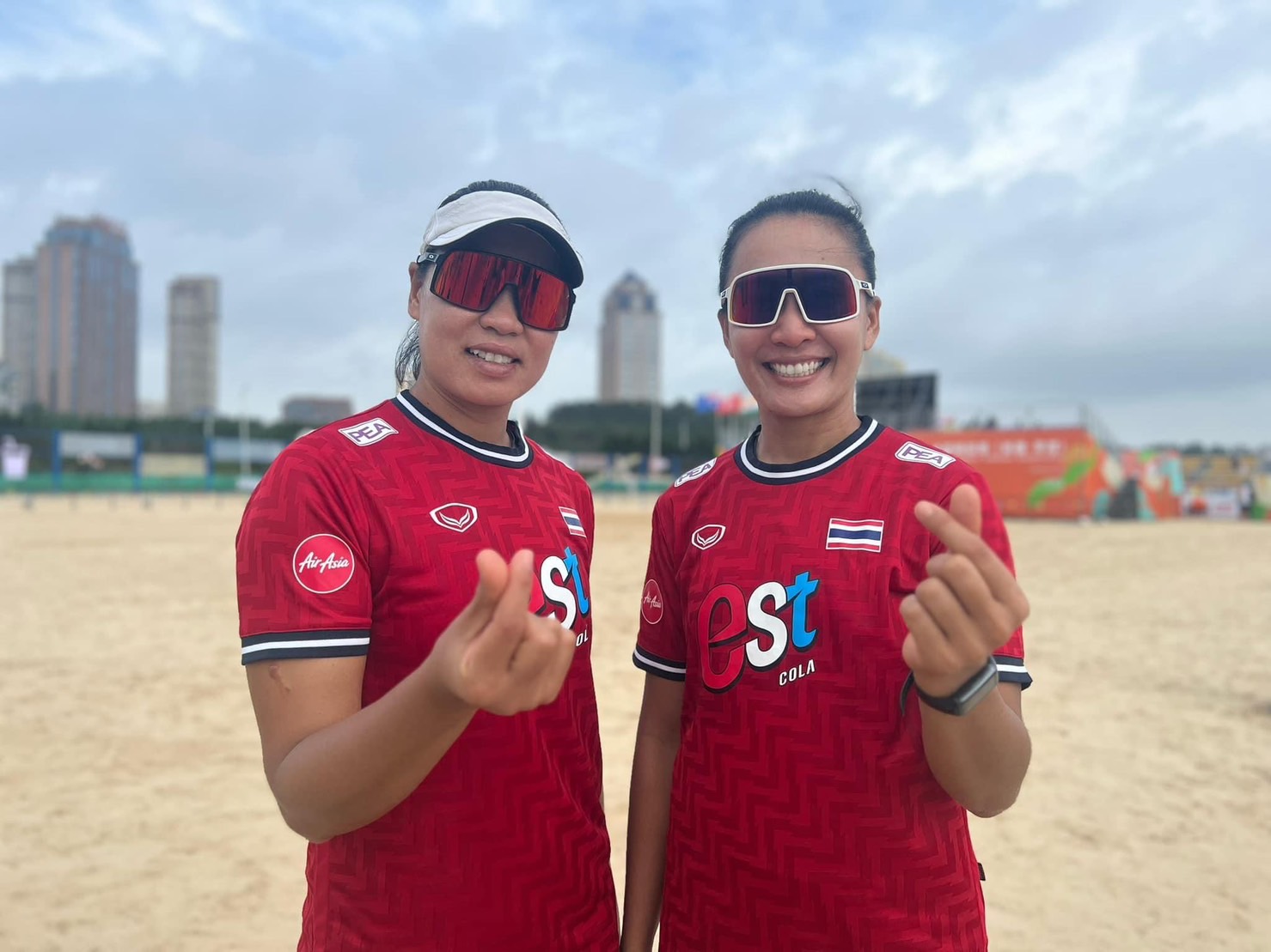 "เอ-ส้ม" วรภัสสร รดารงค์ และ ธนะรัศมิ์ฐา อุดมฉวี รวมพลังตบพาทีมไทยชนะคาซัคสถาน 2-0 เซต เก็บชัยนัดแรก ในการแข่งขันวอลเลย์บอลชายหาดชิงแชมป์เอเชีย 2023 ที่สาธารณรัฐประชาชนจีน