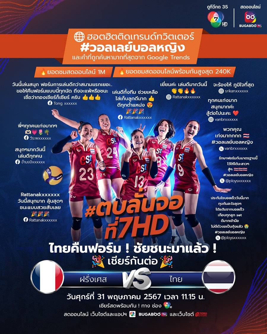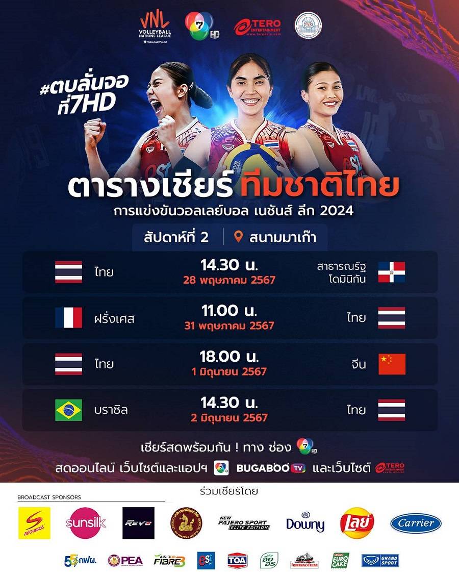 แฟนลูกยางเฮลั่นจอ ทัพลูกยางสาวไทยกู้ศรัทธาแฟนวอลเลย์บอลได้สำเร็จ ออกสตาร์ทสนาม 2 ในศึก วอลเลย์บอล เนชันส์ ลีก 2024 (VNL 2024) ณ กาแล็กซี อารีนา เขตปกครองพิเศษมาเก๊า สู้สุดใจจนคว้าชัยชนะนัดแรกมาครองสมใจแฟนกีฬา โดยแมตช์นี้สาวไทยคืนฟอร์ม เบียดชนะ ทีมชาติโดมินิกัน อันดับ 9 ของโลก ทำให้ขยับขึ้นมาอยู่อันดับที่ 13 ของโลก แมตช์นี้นักตบสาวไทยทุ่มสุดตัว แม้เสียเปรียบหลายด้านทั้งรูปร่างและอาการบาดเจ็บ แต่สวมหัวใจนักสู้ ทำให้สามารถสร้างเกมรุกได้หลากหลาย แถมมีอาวุธเด็ดเป็นบอลเร็ว ตบเก็บแต้มไม่ยั้ง ได้ใจแฟนวอลเลย์บอลที่ชมสดผ่านหน้าจอ และแพลตฟอร์มการถ่ายทอดสดทางออนไลน์มียอดผู้ชมสดออนไลน์พร้อมกันสูงสุด 240,000 วิว ยอดชมรวมออนไลน์ทะลุ 1,000,000 วิว ทั้งยังแท็กทีมส่งเชียร์และส่งกำลังใจผ่านโซเชียลมีเดียถล่มทลาย อาทิ วันนี้สาว ๆ เล่นได้ดีไม่กดดันตัวเอง, ประทับใจฟอร์มการเล่นของทีมไทย บอลเร็วทำงานแล้ว, Thailand ทำถึง พวกคุณเก่งมาก, ทุกคนช่วยกันเล่น สนุกสะใจมาก, ตีหนัก รับดี ลุ้นหัวใจจะวาย, เราทำได้แล้ว ประทับใจบอลเร็ววันนี้มาก และอีกมากมาย แถมยังส่งผลให้ การค้นหา วอลเลย์บอล – ช่อง 7HD ครองอันดับคำที่ถูกค้นหามากที่สุดจาก Google Trends และชุมชน X ที่ส่งแฮชแท็ก #วอลเลย์บอลหญิง ติดเทรนด์อันดับ 1 ต่อเนื่องตลอดทั้งเกม และช่อง 7HD ขอเชิญชวนแฟน ๆ มาร่วมส่งกำลังใจเสิร์ฟพลังบวกให้นักกีฬาของไทยเราแบบส่งตรงคลิกไปที่ลิงก์ https://www.ch7.com/vnl2024/cheerthailand
