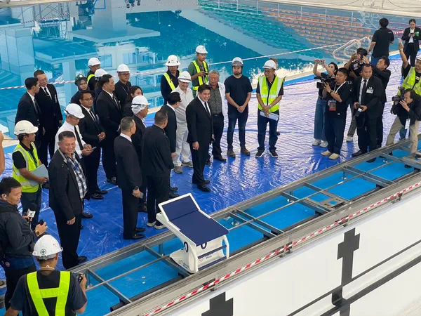 ร.อ.ธรรมนัส ได้ตรวจพื้นที่อย่างละเอียด เริ่มจาก สระกระโดดน้ำ ที่ใส่น้ำเรียบร้อยแล้ว ความลึก 5 เมตร ก่อนเดินต่อไปยัง สระว่ายน้ำหลักขนาด 50 เมตร ซึ่งอยู่ระหว่างการติดตั้งระบบปรับระยะสระให้เปลี่ยนได้จาก 50 เมตรเป็น 25 เมตร และตรวจดู สระวอร์มอัพ ที่อยู่ด้านข้าง ซึ่งขณะนี้เสร็จสมบูรณ์แล้ว ส่วนรายละเอียดอื่น ๆ เช่น การติดตั้งที่นั่งและห้องน้ำยังอยู่ระหว่างเก็บงานขั้นสุดท้าย
