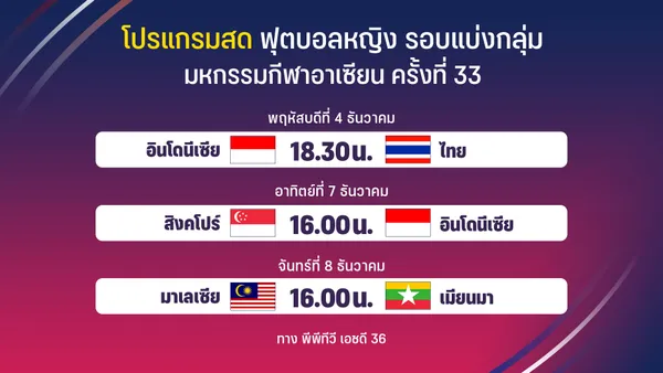 เวลา 18.30 น. : ฟุตบอลหญิง (รอบแรก) อินโดนีเซีย พบ ไทย