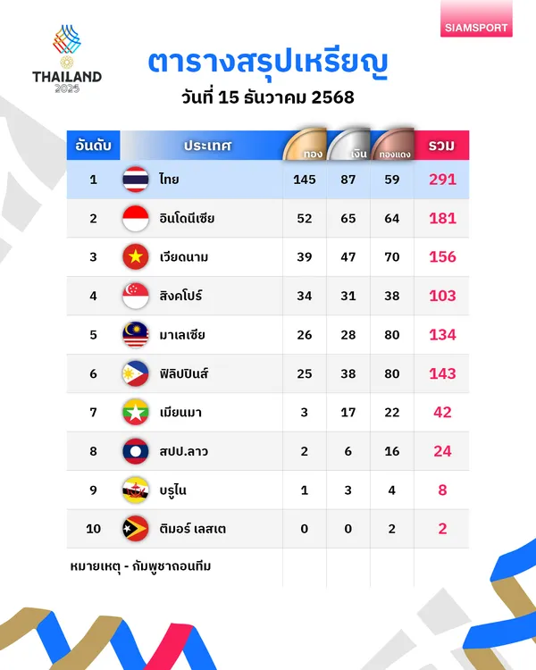 สรุปเหรียญซีเกมส์ 2025 ประจำวันที่ 15 ธันวาคม 2568