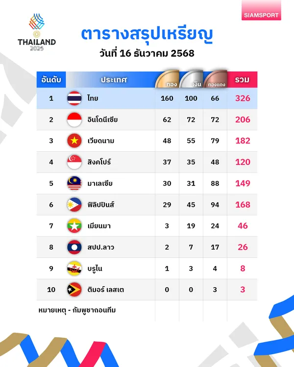 สรุปตารางเหรียญซีเกมส์ 2025 ล่าสุดวันที่ 16 ธันวาคม 2568 ทีมชาติไทยยังครองจ่าฝูงต่อเนื่อง เก็บเพิ่มจากวิ่งผลัด 4×400 เมตรชาย และจักรยาน ดันยอดทองพุ่ง 160 เหรียญ
