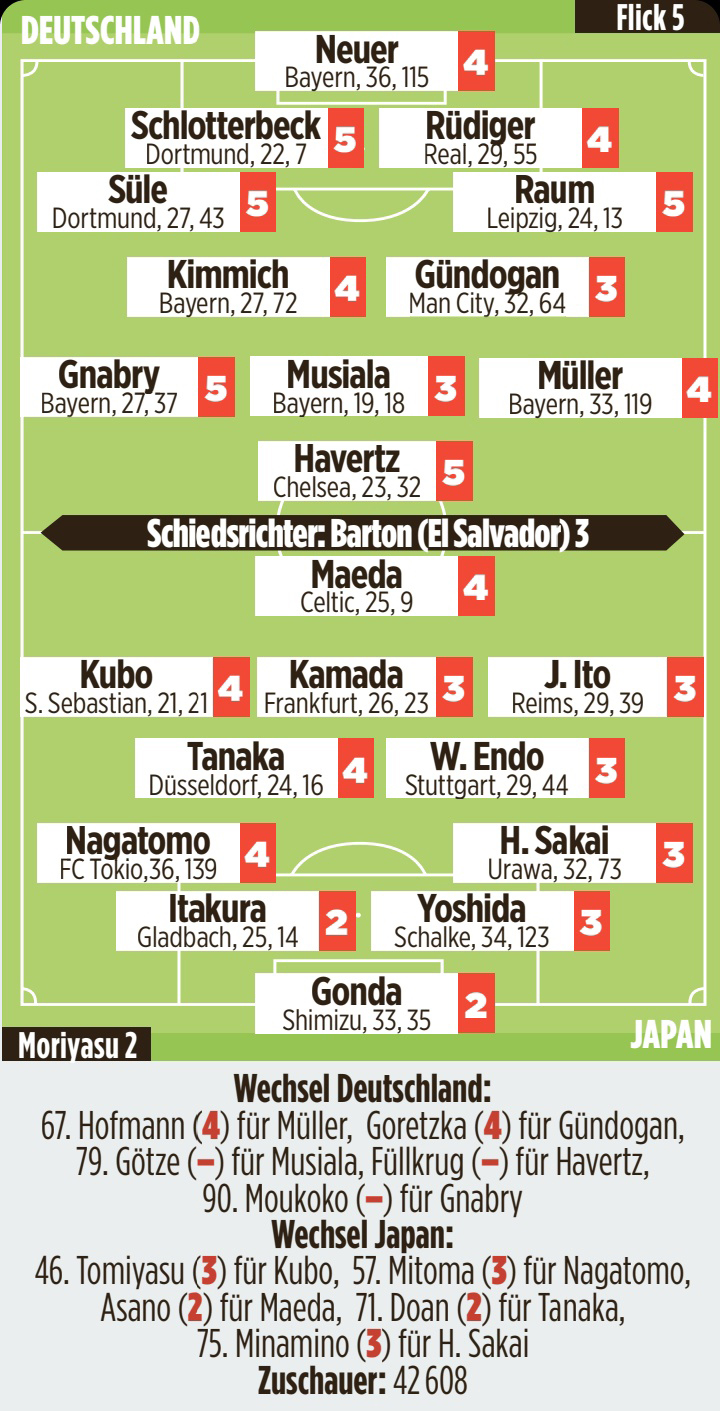 บิลด์ สื่อดังของเยอรมนี ประเคนคะแนนในระดับเกือบต่ำสุดให้กับนักเตะ เยอรมนี 5 คน รวมถึงกับ ฮันซี่ ฟลิค กุนซือทัพ "อินทรีเหล็ก" ส่วนของ ญี่ปุ่น มีนักเตะที่ได้คะแนนดีมากๆ 2 ราย